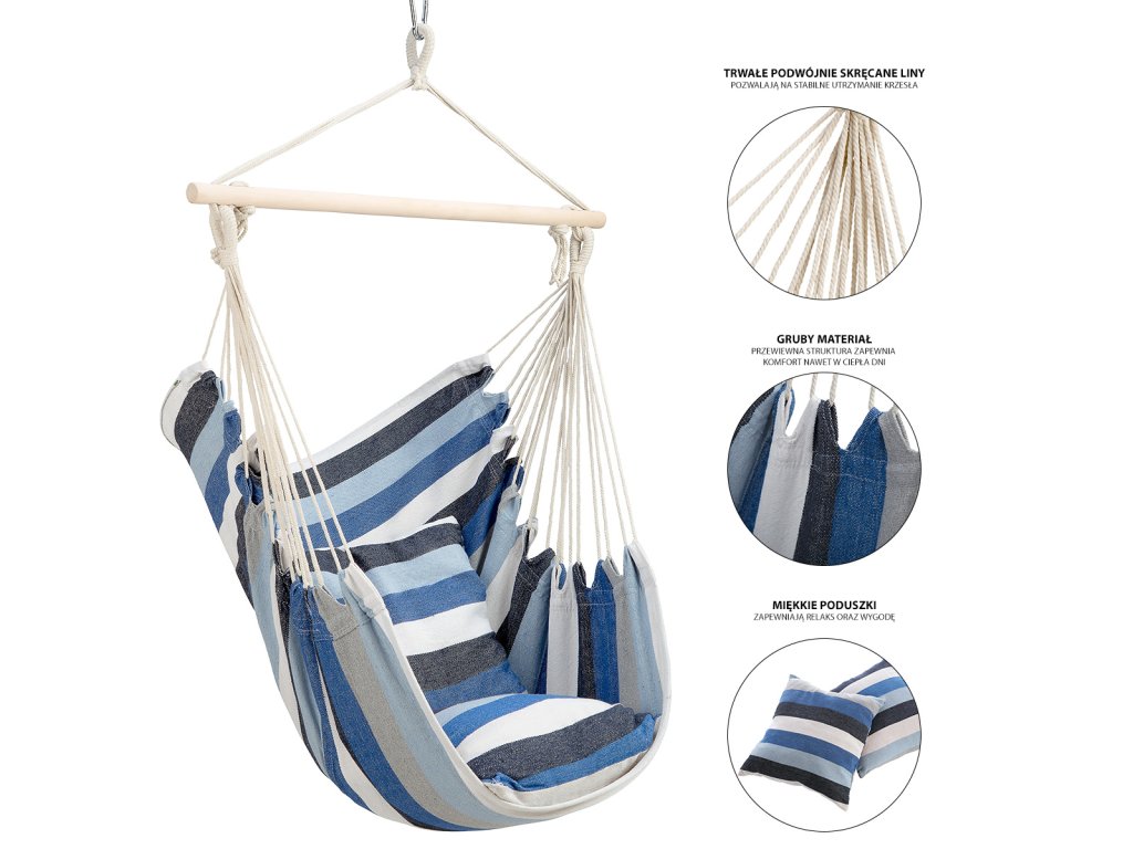 Konstrukce brazilského křesla vychází z houpací sítě. Textilní část je vyrobena z T/C plátna (kombinace polyesteru a bavlny), které je pomocí jednotlivých lan tvarováno do tvaru křesla. Lana prochází přes dřevěnou příčku a sbíhají se do závěsného oka. Křeslo stačí vybalit, zavěsit kamkoliv do vhodné výšky a už můžete odpočívat například při čtení oblíbené knihy. Model NC3107 je navíc vybaven 2 pohodlnými polštáři. Použité materiály zajišťují nejen prodyšnost a pohodlnost křesla, ale také jeho dlouhou životnost a odolnost.