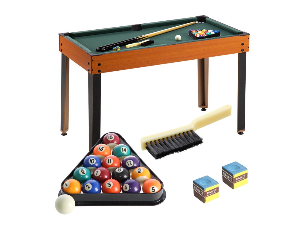 - Biliard včetně tága, trojúhelníku a sady koulí, 2 kříd a smetáčku.