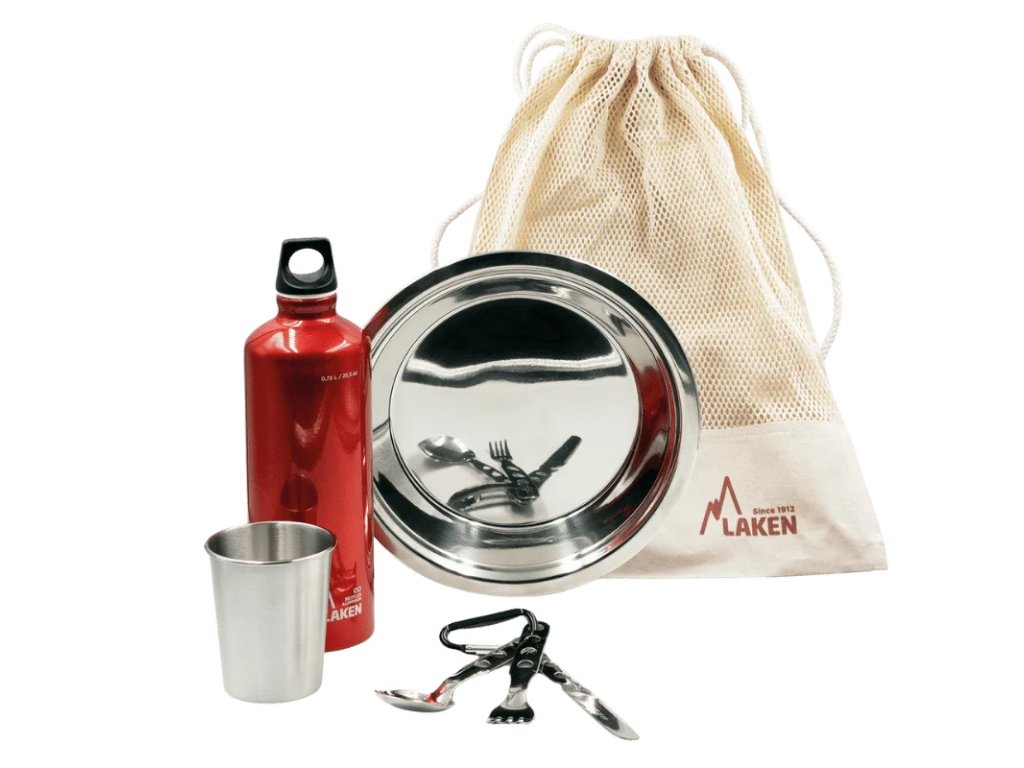 Kompletní kempingová sada obsahuje červenou hliníkovou láhev FUTURA (0,75 l, 100% recyklovaná), nerezový talíř a hrnek, příbor s karabinou a bavlněný sáček na přenášení a sušení.