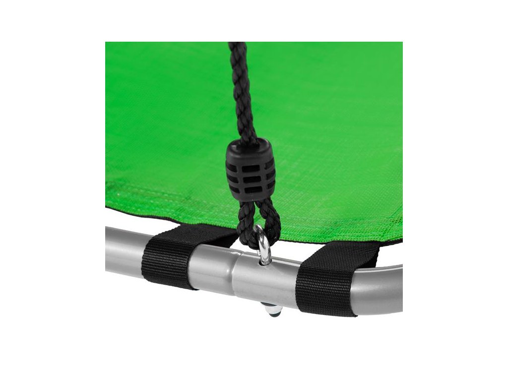 Rám je vyroben z odolné oceli o průměru 25 mm a tloušťce stěny 1,4 mm, což zajišťuje stabilitu a trvanlivost celé konstrukce. Lana o délce 180 cm a tloušťce 1 cm umožňují rychlou montáž houpačky na větve stromů, dřevěné trámy nebo jiné konstrukční prvky. Maximální nosnost až 150 kg zajišťuje bezpečné používání pro děti i dospělé.