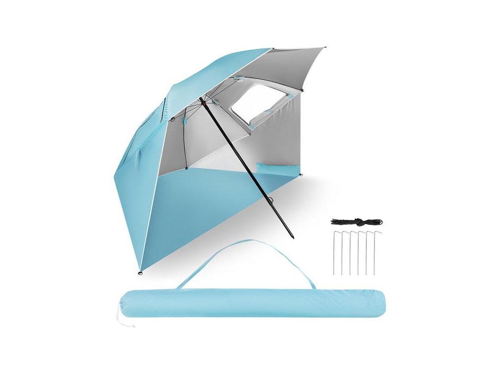 Uvnitř slunečníku se nachází praktická kapsa na drobnosti – ideální na telefon, sluneční brýle, klíče nebo opalovací krém. Celý slunečník je zabalen v praktické přepravní tašce, která usnadňuje jeho přenášení a skladování. Součástí balení jsou také kolíky a upevňovací lana, které zajišťují stabilitu konstrukce i při silnějším větru.