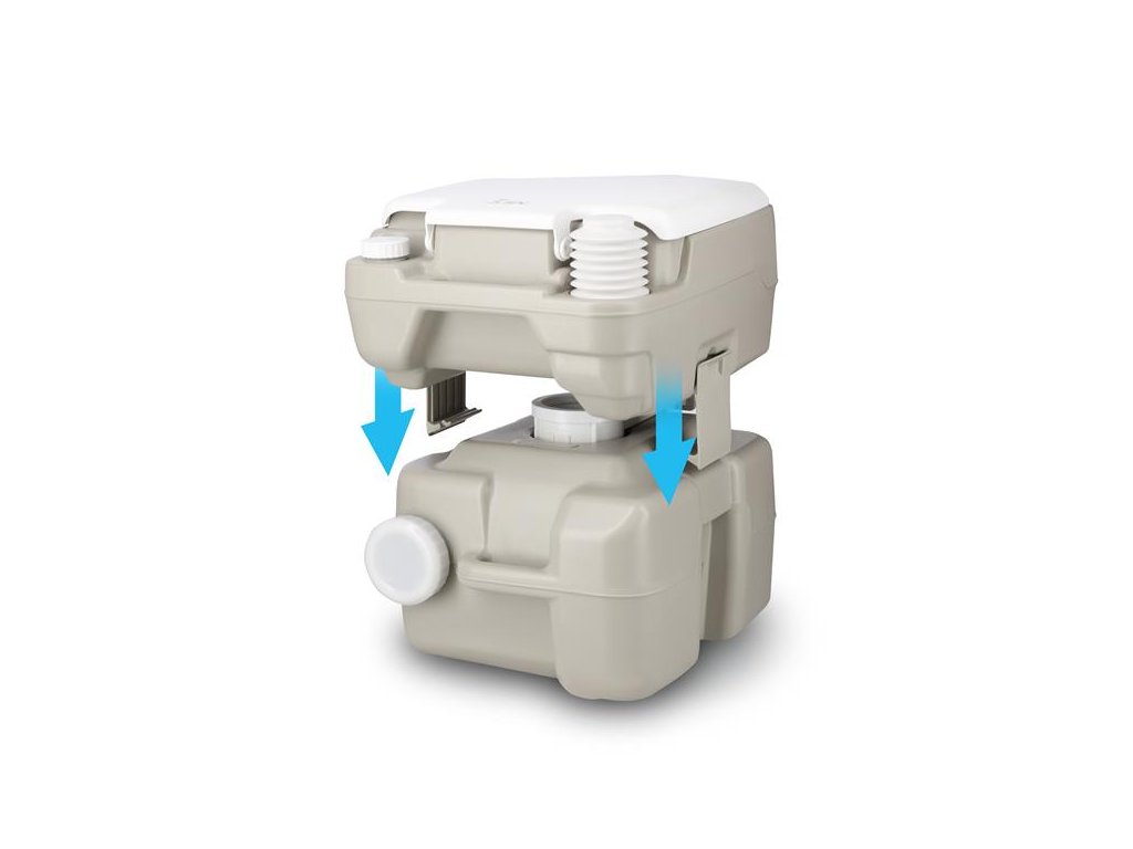 Toaleta je vyrobena z lehkého, ale velmi odolného HDPE, takže je odolná vůči mechanickému poškození a povětrnostním podmínkám. Navzdory svému kompaktnímu tvaru nabízí stabilní a pohodlné sezení s výškou vhodnou pro dospělé i děti. Proces plnění nádrže na čistou vodu se provádí ručně, což dále zvyšuje její nezávislost při používání. Vyprazdňování odpadní nádrže je snadné a hygienické díky širokému vypouštěcímu otvoru.
