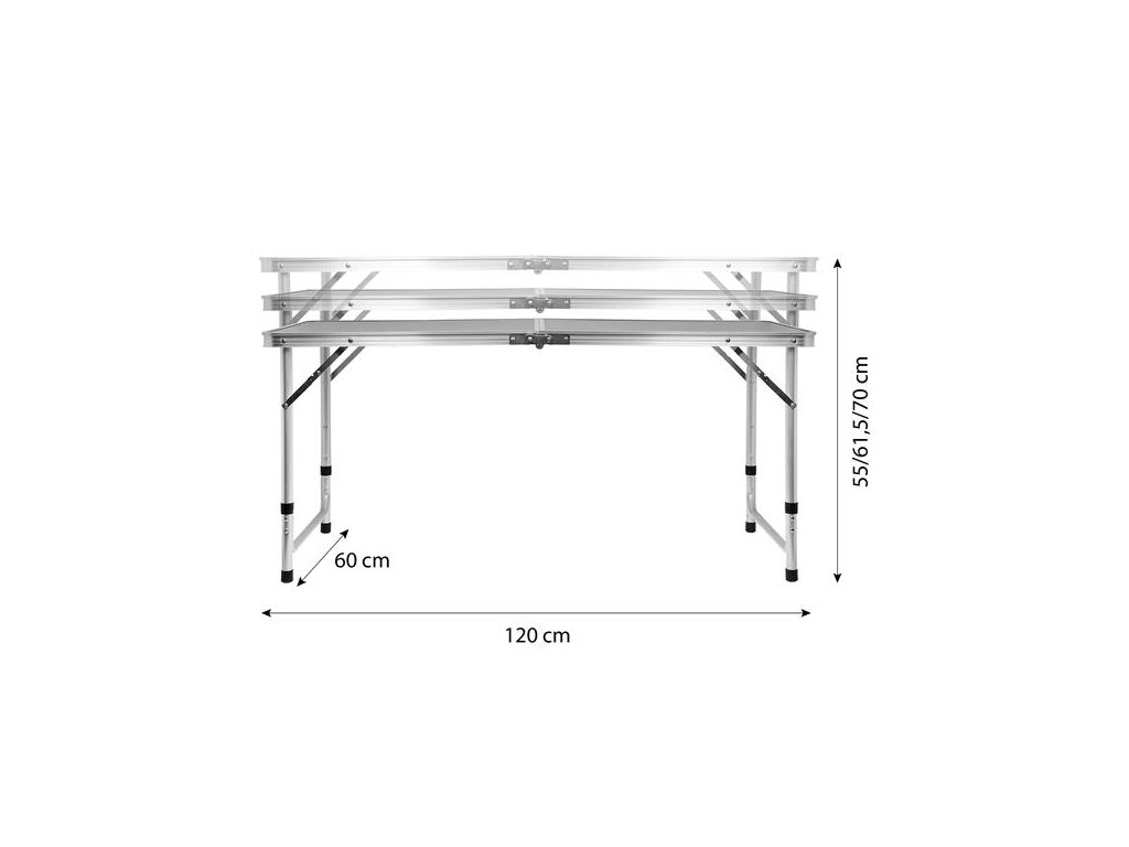 Stůl má desku o rozměrech 120 x 60 cm, která je vyrobena z laminované MDF desky. Pevná, lehká hliníková konstrukce zajišťuje odolnost a stabilitu. Výšku stolu lze nastavit ve třech úrovních (55, 61,5 a 70 cm), což umožňuje pohodlné používání jak dětem, tak dospělým. Stůl se jednoduše skládá – po složení nohou a „přeložení“ na polovinu vznikne kompaktní kufřík o rozměrech 60 x 60 x 6,5 cm. Na boku je praktická rukojeť, která usnadňuje přenášení celé sady.