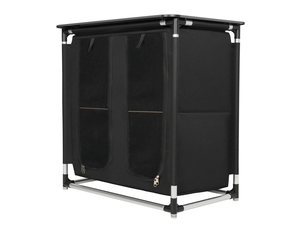 Skříň NC3032 má celkem 4 sekce, které umožňují pohodlné uložení potravin, nádobí, oblečení nebo turistického vybavení. Každá sekce je vyztužena policí z laminované překližky. Horní, pracovní desku tvoří 9 hliníkových lamel, deska má rozměr 83 x 52 cm. Přední panely na zip účinně chrání obsah před prachem, větrem a hmyzem.