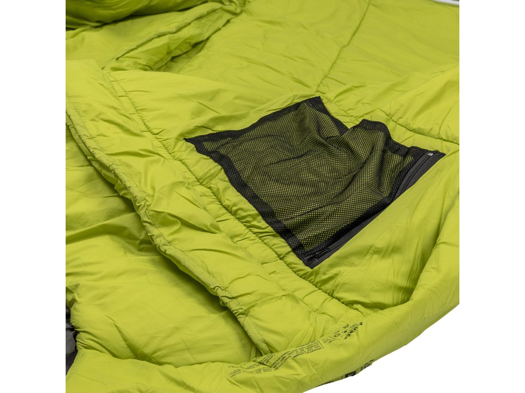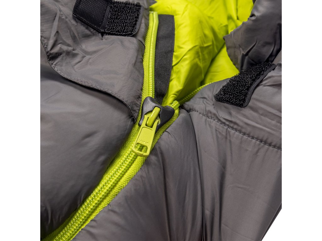 Zapínání: spacák je vybaven značkovým zipem YKK se speciálním plastovým chráničem, který zabraňuje vniknutí látky do jezdce a samovolnému rozepínání. U hlavy je zip ještě zajištěn klopou na suchý zip, která zamezuje samovolnému otevření zipu.