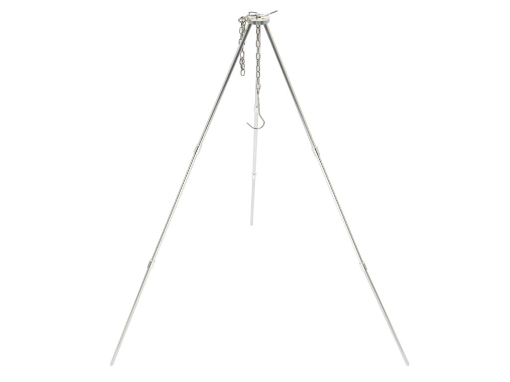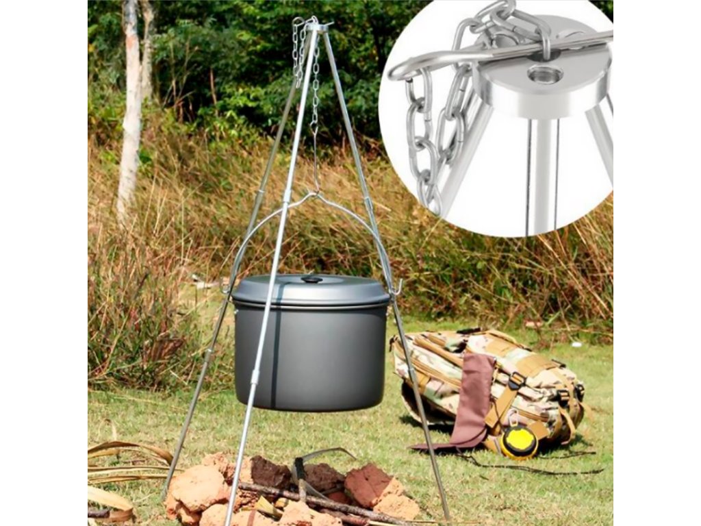 Skládací trojnožka s řetízkem a háčkem na zavěšení kotlíku. Nastavitelná výška zavěšení. Délka řetězu: 50 cm. Ideální pomocník při vaření v kotlíku na ohništi. Malé a lehké balení.